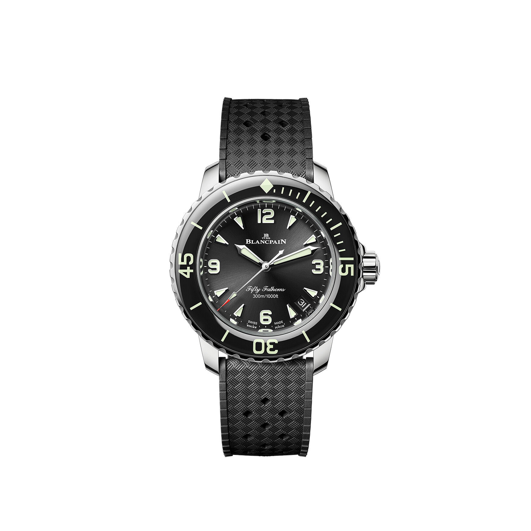 This Fifty Fathoms Automatique model is designed for passionate divers as well as connoisseurs of exceptional watchmaking. Its 42.3 mm satin-finished Grade 23 titanium case frames a sleek black dial with a date display. Powered by the automatic calibre 1315, the watch delivers outstanding performance with a five-day power reserve. The unidirectional sapphire bezel, a signature feature of the collection, ensures optimal legibility in all conditions. Completed with a sporty rubber strap and folding clasp, it seamlessly combines comfort, technical excellence, and elegance.