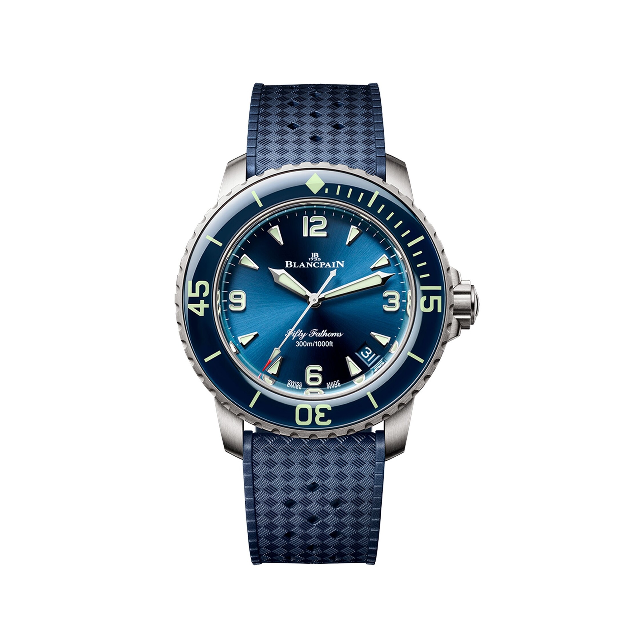 Designed for passionate divers as well as connoisseurs of fine watchmaking, the Fifty Fathoms Automatic stands out with its satin-finished grade 23 titanium case measuring 42.3 mm, framing a blue dial with a date window. Powered by the automatic Calibre 1315, it delivers outstanding performance with a five-day power reserve. Its signature unidirectional sapphire bezel ensures optimal legibility. Fitted with a sporty rubber strap and a folding clasp, this timepiece perfectly balances comfort, technical excellence, and elegance.