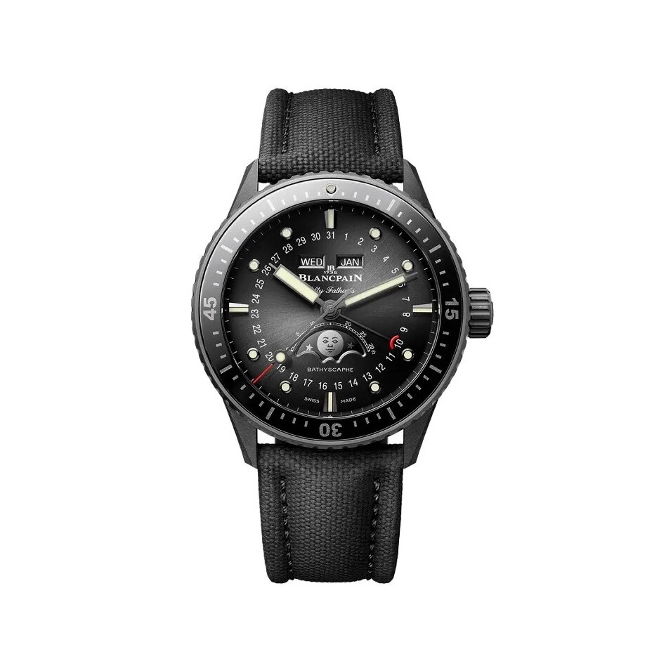The Bathyscaphe Quantième Complet Phases de Lune unites diving performance with refined complication. Housed in a hand-finished black ceramic case, this iconic 43.6 mm timepiece offers exceptional scratch resistance and comfort. Powered by caliber 6654.P.4, it offers a 72-hour power reserve. Its sunburst black dial showcases a complete calendar, moon phases, and seconds complications. A sail-canvas strap with a pin buckle complete this sleek high-performing timepiece.