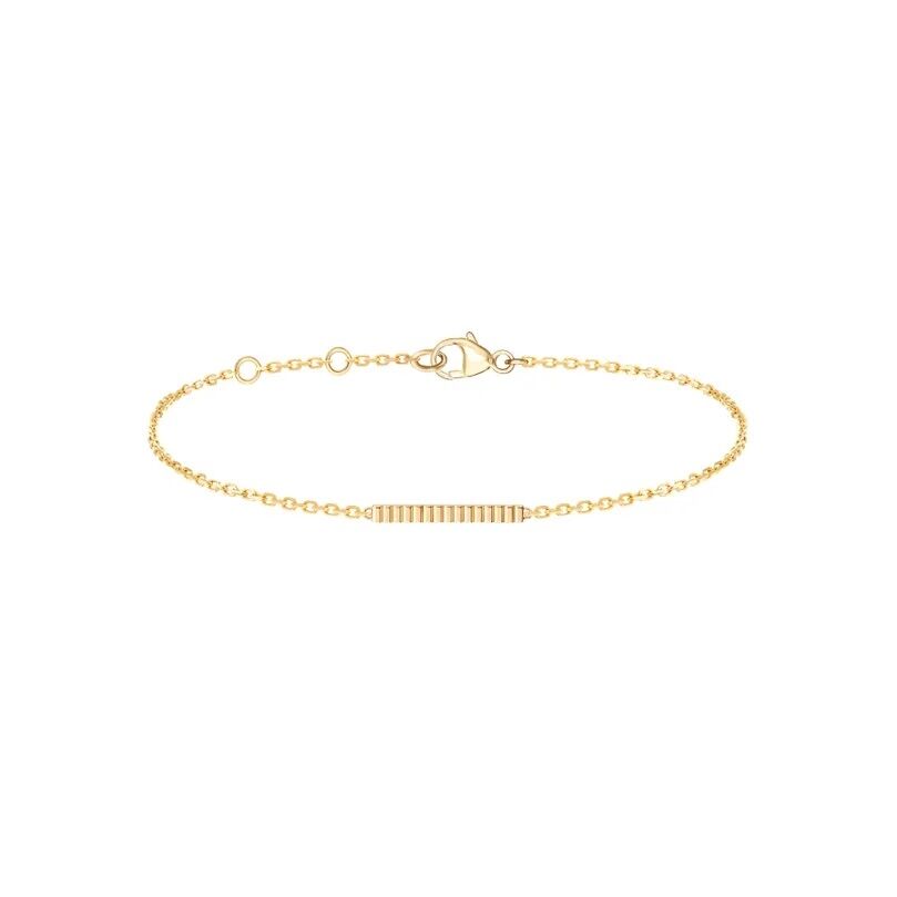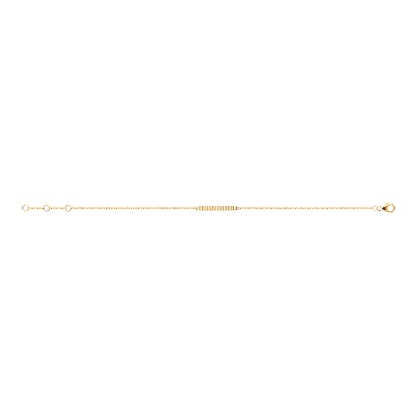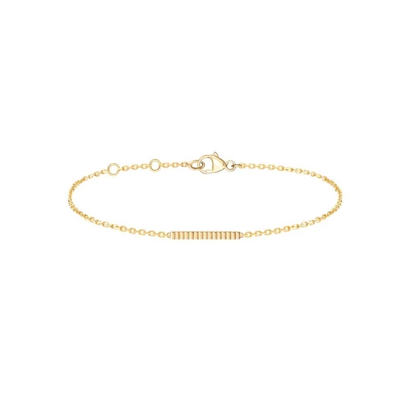 Crafted in yellow gold, the bracelet features the distinctive Grosgrain motif, characterised by its finely engraved texture inspired by couture ribbons. The elegant chain design offers lightness and comfort, making it ideal for everyday wear.