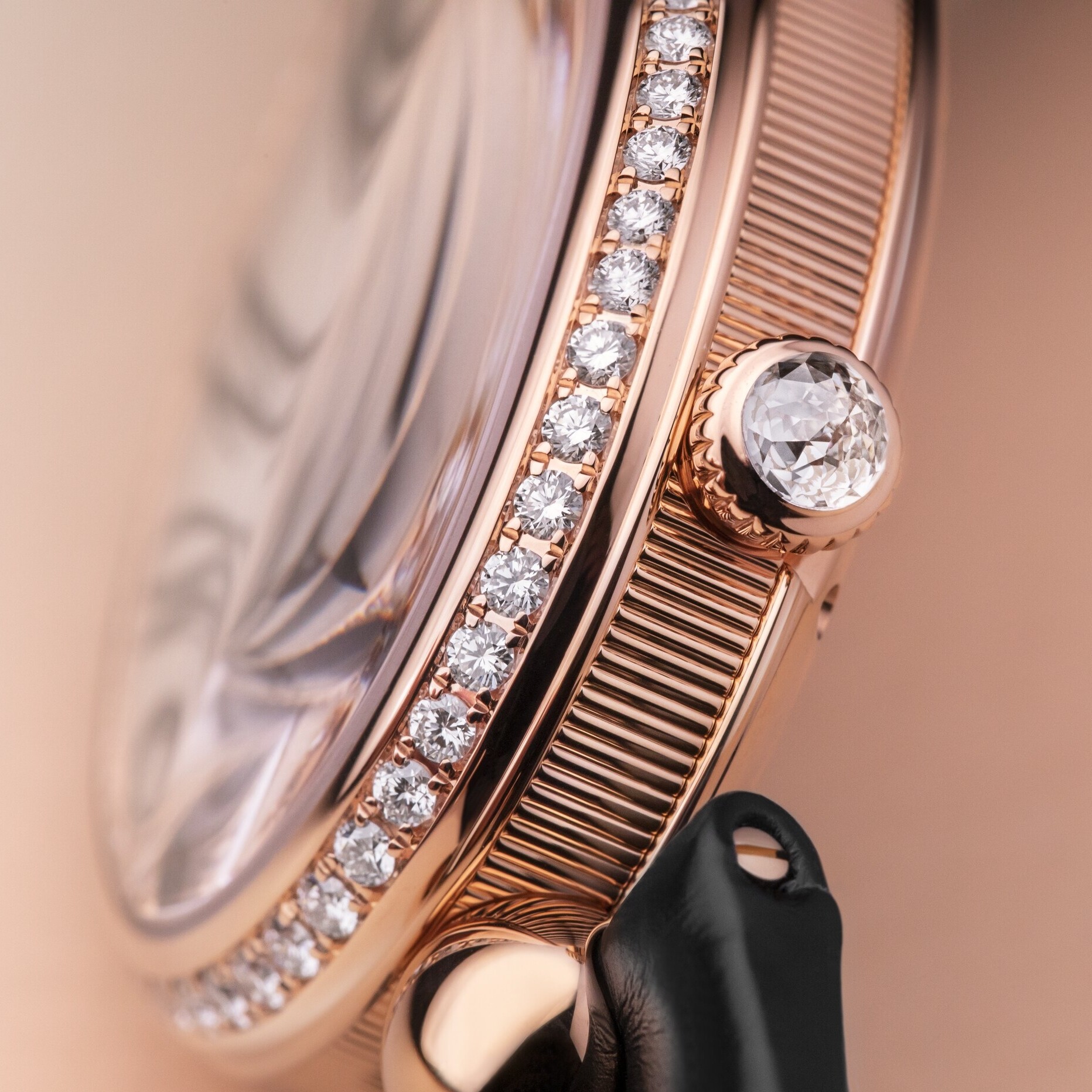This model is crafted in rose gold and set with diamonds on the bezel and dial, enhancing light reflection and the curvature of the case.