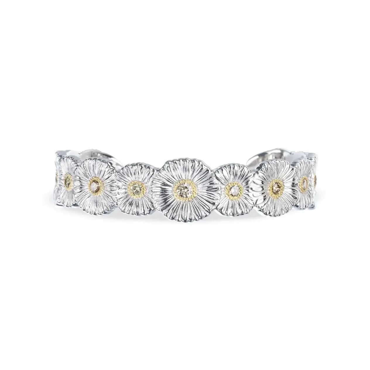 The Buccellati Blossoms Daisy narrow cuff bracelet in sterling silver with gold accents and brown diamond is a jewellery creation from the Blossoms line. It features the Daisy motif and a slim cuff design.