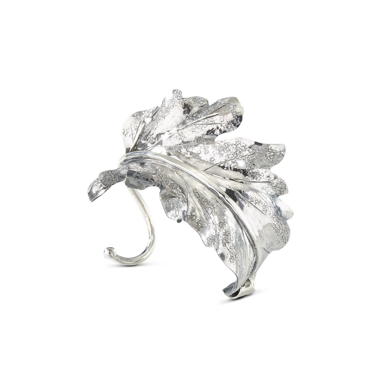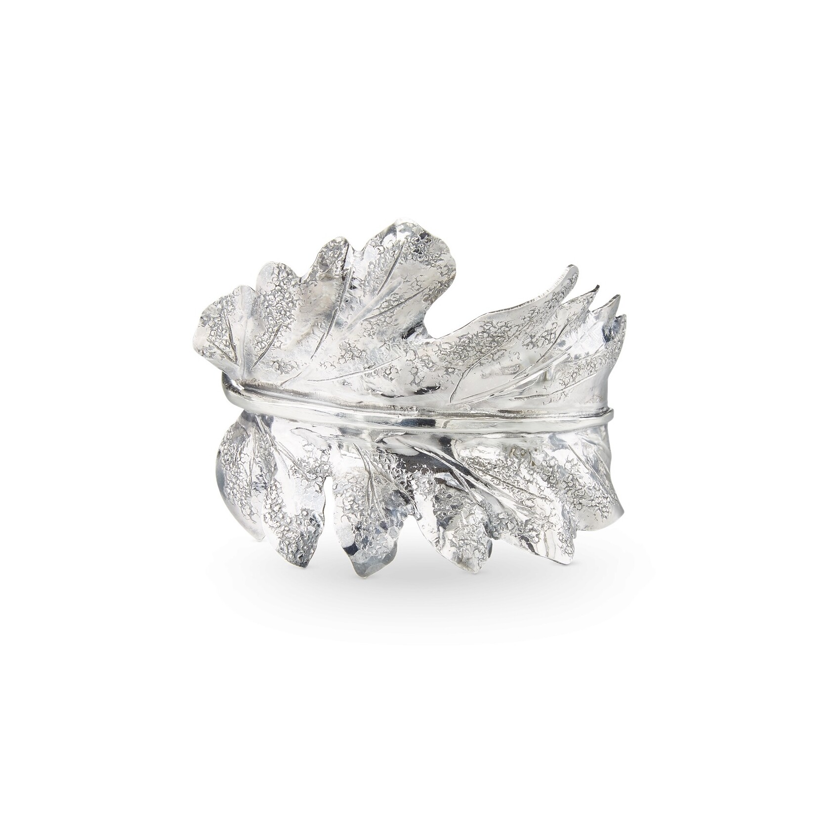 Made from sterling silver 925/1000, the bracelet showcases the Leaf motif with a textured finish. Without gemstones, the design highlights the metalwork and artisanal execution.
