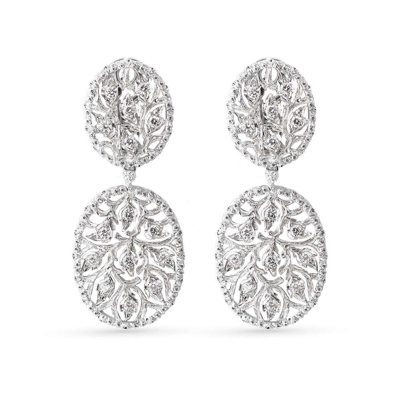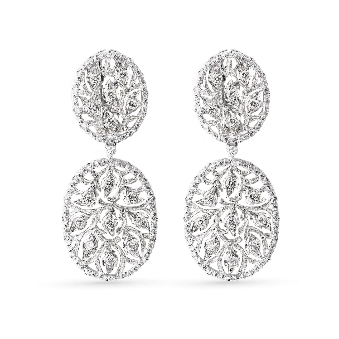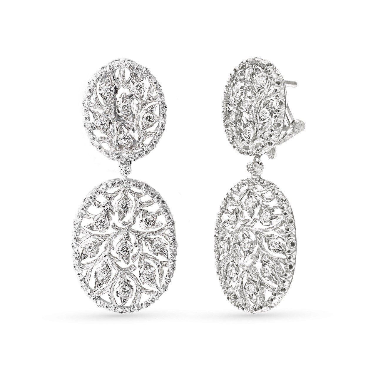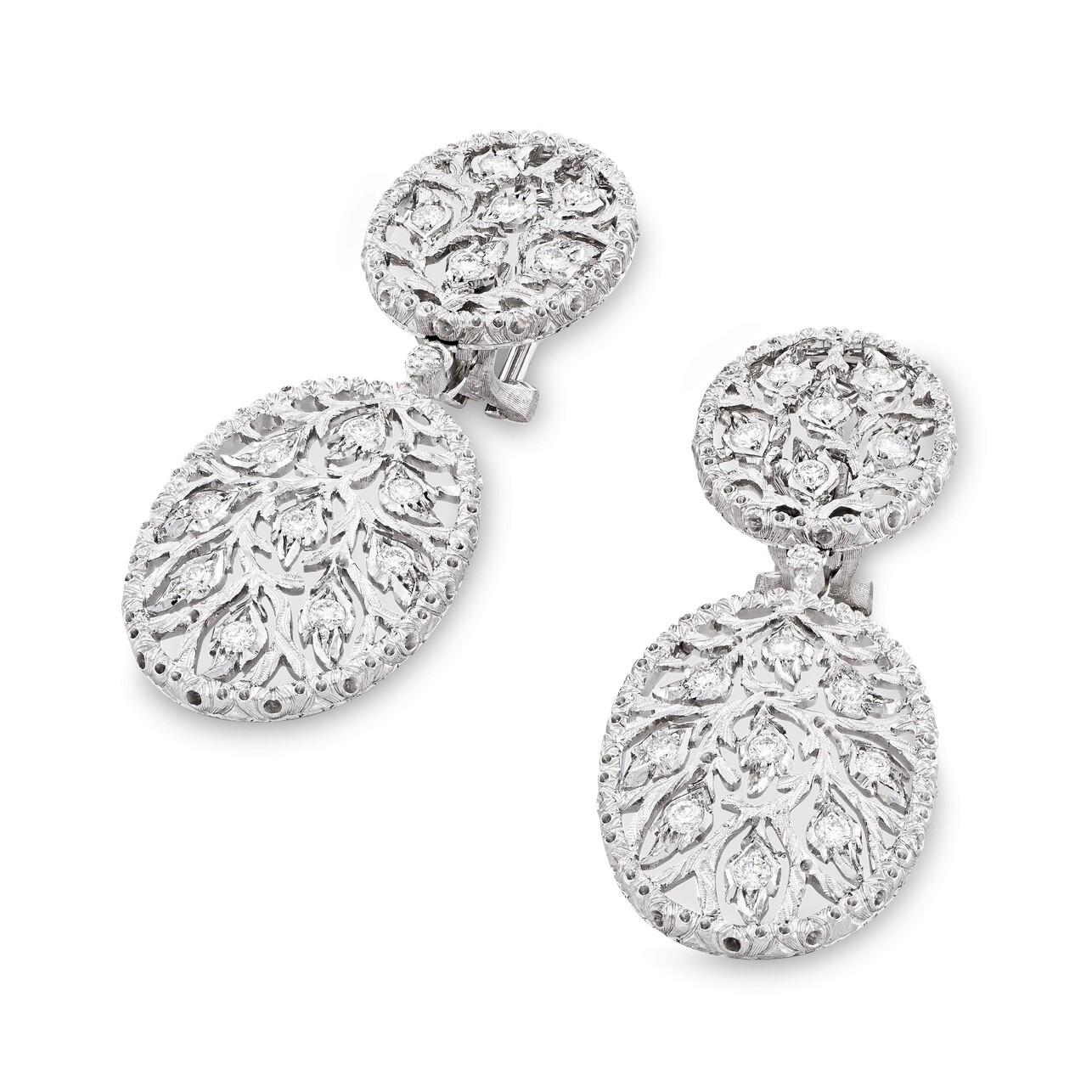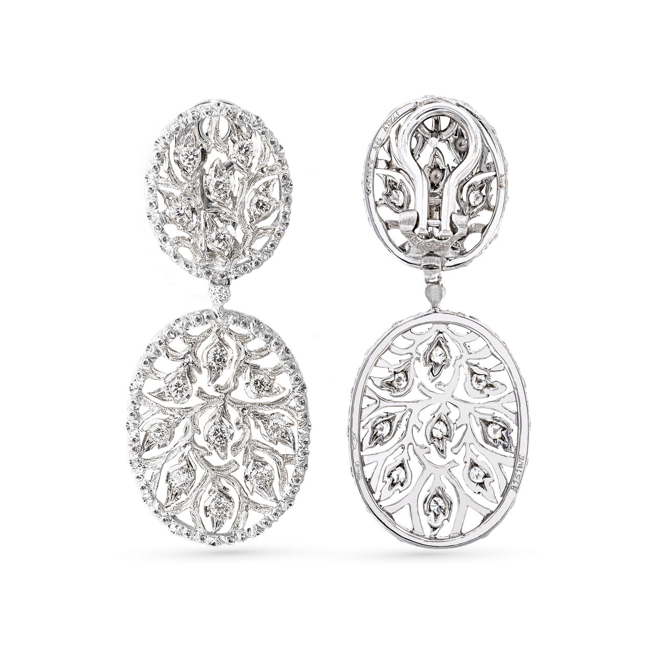 Crafted in 18k white gold, the earrings feature an openwork structure set with diamonds, enhanced by white gold leaf-shaped edges that introduce a subtle natural inspiration. This decorative detailing highlights Buccellati’s distinctive approach to metalwork.