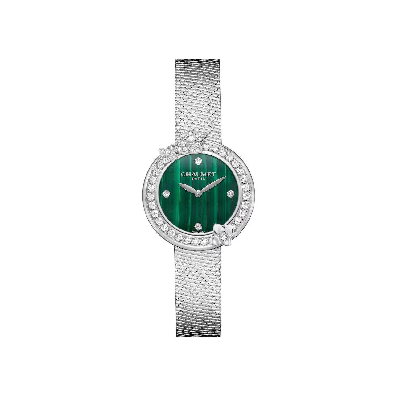 The Hortensia watch by Chaumet is a refined jewellery timepiece in stainless steel, enriched with diamonds and a malachite dial, combining feminine elegance with Swiss precision.