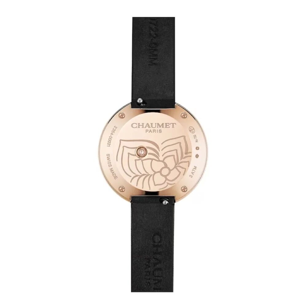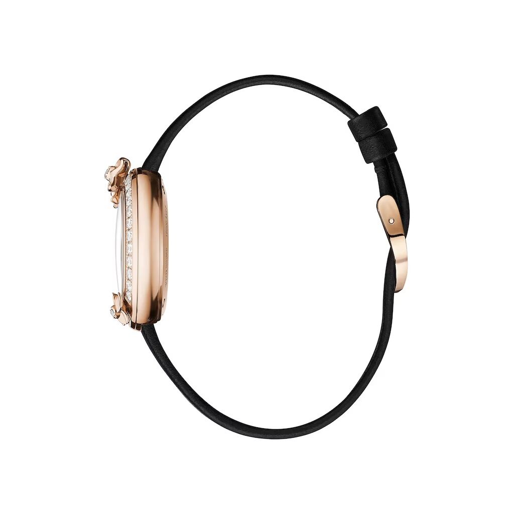 Crafted in rose gold, the case features a distinctive floral silhouette adorned with diamonds, bringing warmth, brilliance and femininity to the wrist. The dial is delicately integrated within the flower design, emphasising the watch’s refined jewellery character.