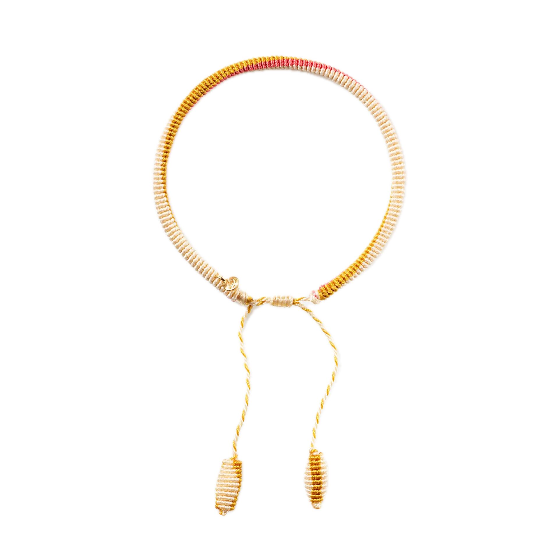 A subtle 18k yellow gold medal adds a refined precious detail. The bracelet is fitted with an adjustable sliding knot for a comfortable fit, while the cord ends are finished with sculpted details and completed with tassels, enhancing the handcrafted aesthetic.