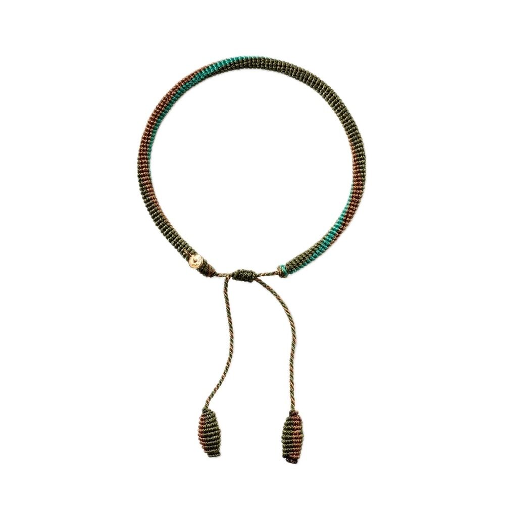 A subtle 18k yellow gold medal adds a refined precious touch. The bracelet is fitted with an adjustable sliding knot for a comfortable fit, while the cord ends are finished with sculpted details and completed with tassels, reinforcing the relaxed yet sophisticated character of the design.