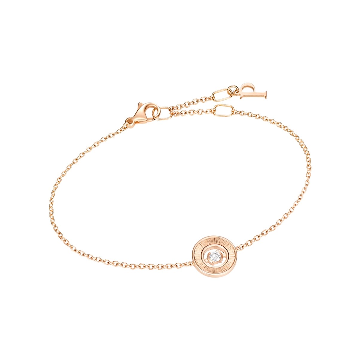 The Possession “Decor Palace” bracelet in 18K rose gold is set with a brilliant-cut diamond of approximately 0.05 carat, adding a luminous and precious touch to this contemporary icon of feminine elegance and modern luxury.
