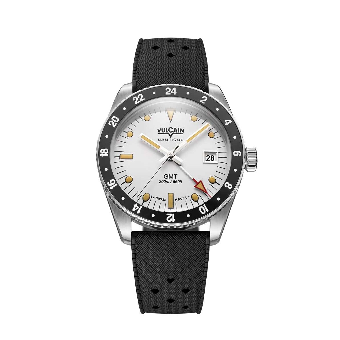 The stainless steel case houses a clean white dial, enhanced by beige Super-LumiNova on the hands and hour markers for a vintage-inspired look and excellent legibility. The GMT function allows tracking of a second time zone, making this watch an ideal companion for frequent travellers.
