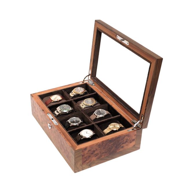Un hôtel cinq étoiles pour vos montres, alliant la passion de l’artisanat, le bois luxueux, le velours éclatant et le verre anti-reflets.