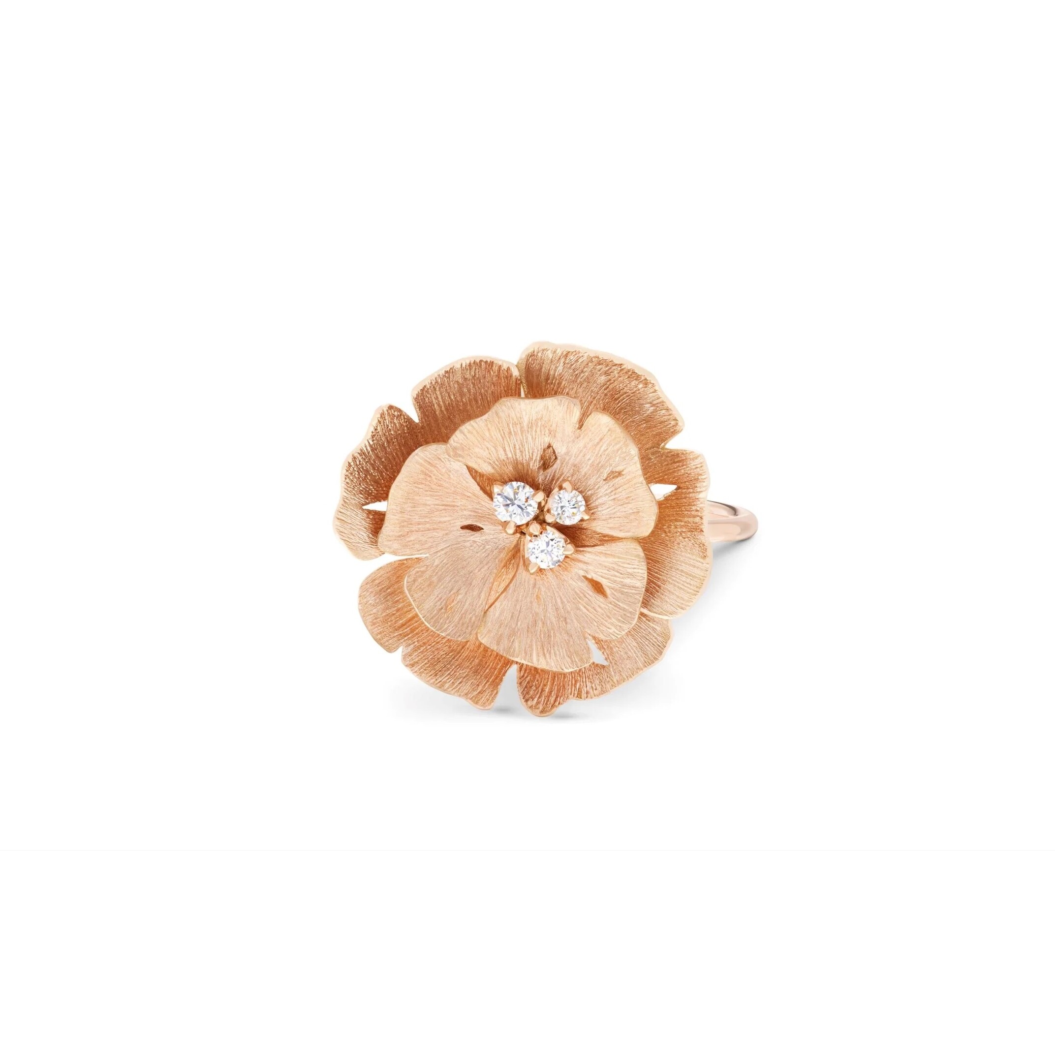 La bague Ginkgo de Vever révèle une silhouette organique et lumineuse : six feuilles de ginkgo s’épanouissent en corolle pour former une fleur contemporaine. Sa surface satinée capte la lumière avec subtilité, soulignant la douceur et la chaleur de l’or rose 18 carats.