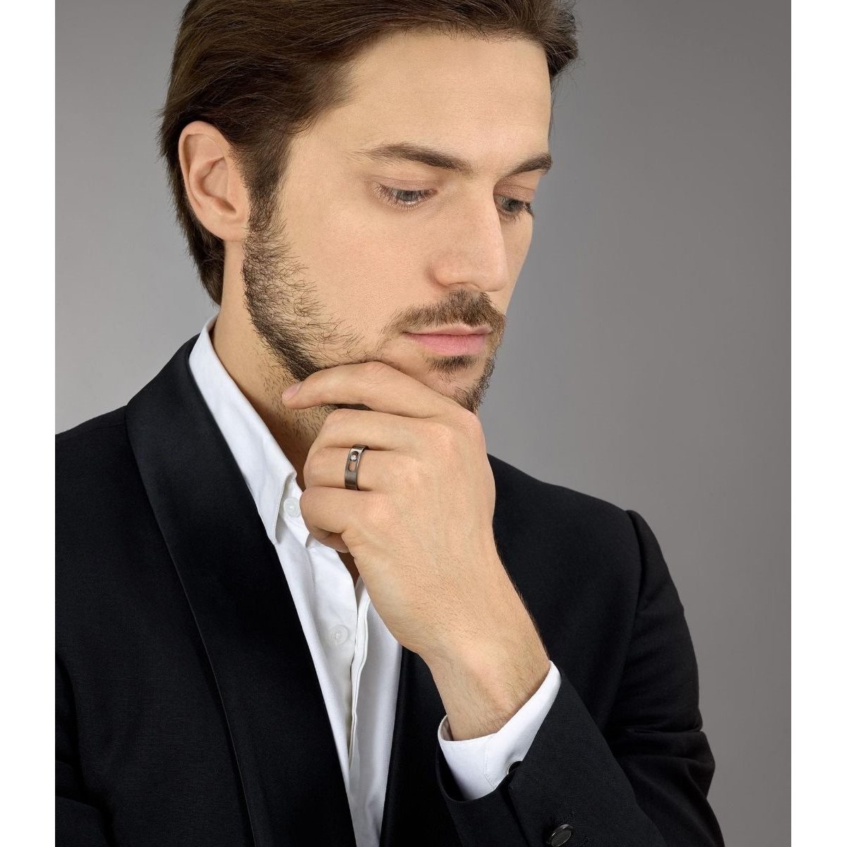 Dans une version petit modèle, cette bague en titane brossé couleur graphite et sertie fait partie de la collection de joaillerie Move, icone de la Maison Messika.
