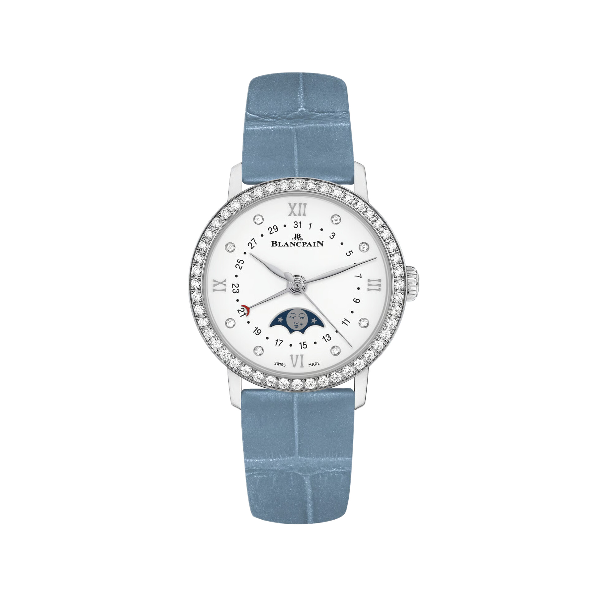 La Villeret Quantième Phases de Lune de Blancpain incarne l’élégance classique et la tradition horlogère de la collection Villeret. Fidèle à l’esthétique épurée de la Maison, ce garde-temps se distingue par un cadran raffiné qui associe quantième complet et indication des phases de lune, complications emblématiques de Blancpain.